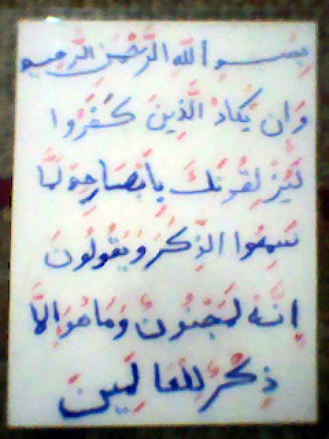 - وإِن یَکادُ الّذینَ کَفَروا لَیُزلِقونَکَ بِأَبصارِهِم لَمّا سَمِعُوا الذِّکرَ و یَقولونَ إِنَّهُ لَمَجنونٌ * و مَا هُوَ إِلاّ ذِکرٌ لِلعالَمین *